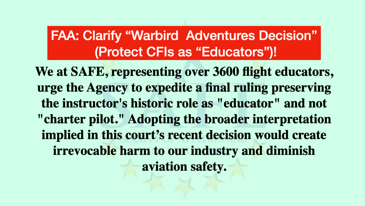 We at SAFE, representing over 3600 flight educators, urge the Agency to expedite a final ruling preserving the instructor’s historic role as “educator” and not “charter pilot.” Adopting the broader interpretation implied in this court’s recent decision would create irrevocable harm to our industry and diminish aviation safety.