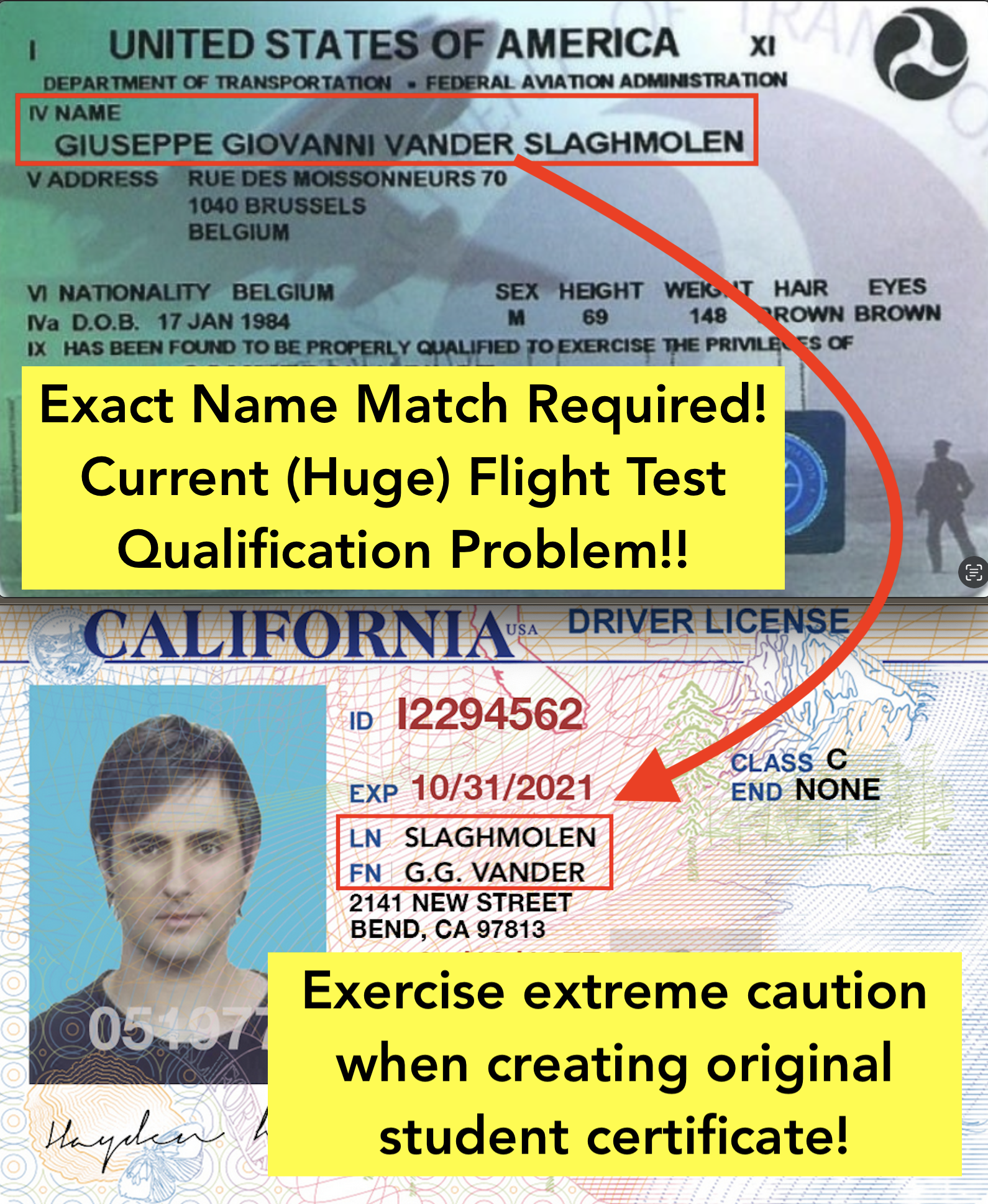 Another common way to not qualify when walking in to meet the DPE is the lack of a full legal name and an exact name match between your pilot certificate (usually student) and your legal government ID. All documents must have your full legal name (Last, First, and Middle) and be a perfect name match (or no FAA practical test). The DPE can “attest” to the knowledge test match based on a supplied document like a passport.