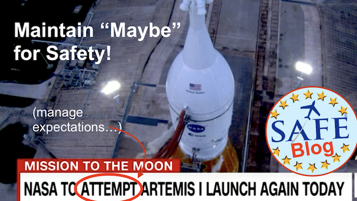 The NASA Artemis One “attempt” at launch last week was a perfect example of proper “safety mindset.” And today, NASA is carefully controlling expectations by saying we “might” have a launch *if* everything works according to plan. If a couple of minor things go wrong, perhaps delay and pivot to mitigate the risks. Pressing on with a plan in the face of obvious risks and dramatic environmental changes is just dangerous. We should always regard any planned aviation event as a *MAYBE* for safety; cultivate a stoic attitude for safety.