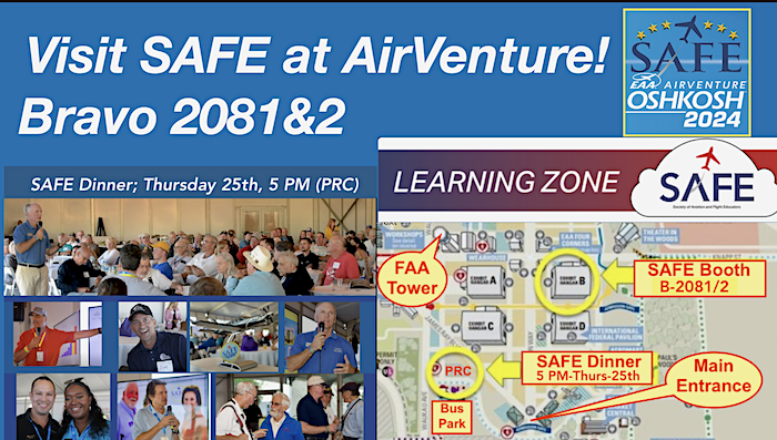Airventure (OSH)24 has been added to our “SAFE Toolkit” App (free download). This App has directions to all our events and provides push notifications of all SAFE events at the show -“allow notifications!” Additionally, the toolkit is chock full of CFI resources and helpful hints for applicants in the “Checkride-Ready™” tab (DPE best advice for flight test success).