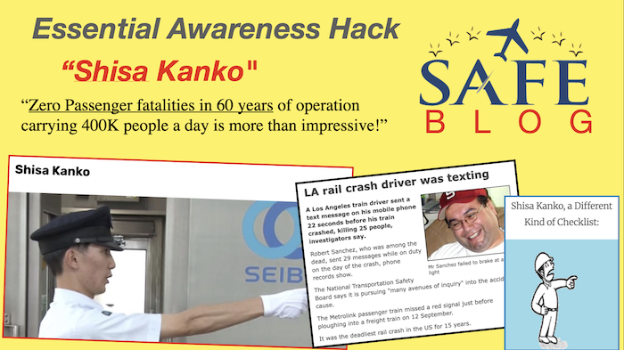 The Japanese term “Shisa Kanko” loosely translates as “pointing and calling.” More accurately, it involves the safety practice of pointing at important indicators and calling out their status. This practice was developed by the Japanese railway system in 1913 and has led to an incredible level of safety and efficiency in that system. According to Dr. Mica Endsley, 76.3% of aviation accidents studied occurred from a simple failure to perceive the risk. Safety depends on awareness.